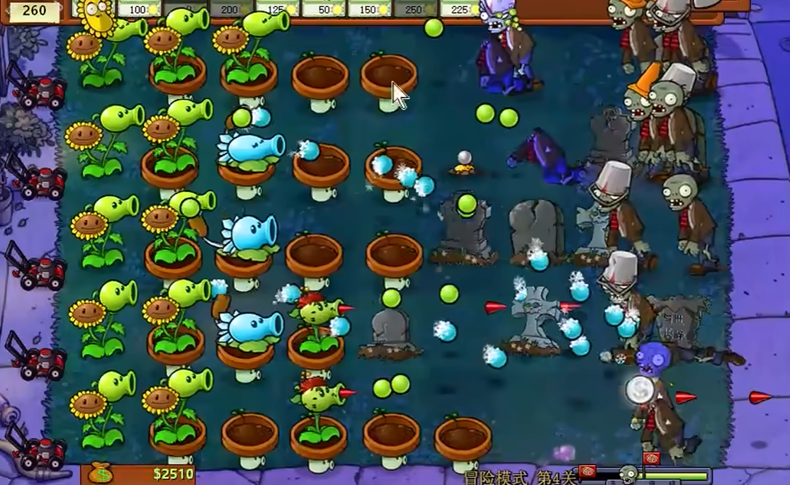 泳池关卡的第四关打法稍有不同,开局要在左侧种满五个阳光向日葵,泳池里放豌豆荷叶。等攒够阳光后开始布置西瓜喷菇和寒冰坚果,西瓜喷菇的范围伤害特别适合清理成群僵尸。寒冰坚果放在中间位置能冻住路过僵尸,给输出植物创造机会。夜晚关卡最麻烦的就是视野受限和阳光不足,所以开局发展经济是关键。寒冰香蒲射手减速、大蒜花改变路线、小盆菇免费铺场,把这些特性结合起来就能打出漂亮配合。