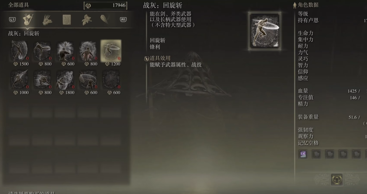 回旋斩战灰的使用条件较为宽松,适用于直剑、曲剑、大剑等多数近战武器,无需特定剧情推进即可装备。该战技的特点是发动速度快且可连续释放两次,第二次攻击带有追击效果,对群体敌人有显著压制作用。若玩家力量属性不足25点或灵巧不足14点,需先提升相应属性才能发挥武器最大效能。