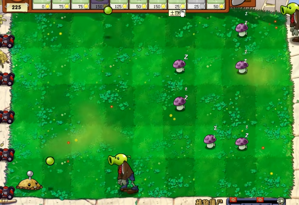 中期发展阶段需确保拥有5-6个向日葵后开始补充攻击型植物。水路区域可种植水草进行防御,该关卡不会从水中冒出僵尸,因此水路相对安全。土豆地雷因高度优势不会被豌豆攻击,可有效拖延僵尸前进;窝瓜则需种植在靠前位置。樱桃炸弹和火爆辣椒等范围伤害植物应保留至关键时刻使用,特别是应对机枪僵尸等高威胁目标。此阶段需注意阳光存量,适时铲除非关键位置的植物回收资源。