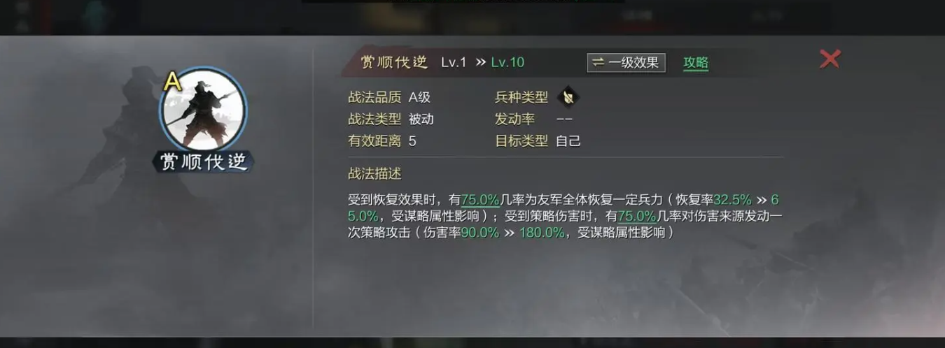 周瑜的强度源于其战法玄武洰流,该技能具备群体怯战与策略伤害的双重效果,尤其克制依赖普攻的菜刀队。战法需1回合准备,发动率为30%,因此搭配高速高谋武将(如吕蒙)可提升先手优势。若追求稳定输出,可携带赏顺伐逆等辅助战法;若走控制路线,浑水摸鱼十面埋伏能进一步强化群体压制能力。需注意避免与普攻型武将(如马超)组队,以免战法冲突。