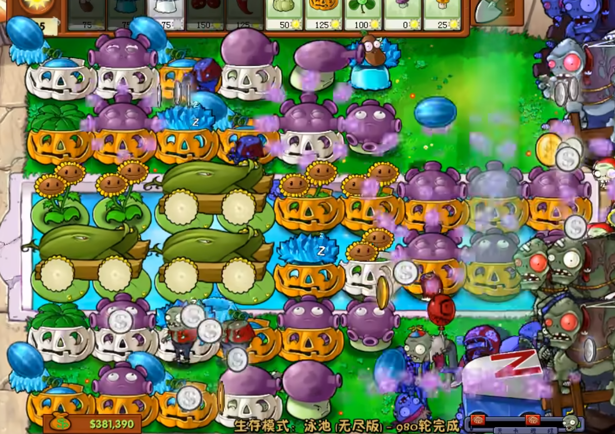 布局阶段需遵循前防后攻原则,陆地最前排放置地刺王或坚果墙吸收伤害,水路后排放置玉米投手提供远程火力。冰西瓜应覆盖2、5行以实现全图减速,忧郁蘑菇需成列布置在临近水路的陆地位置以拦截潜水僵尸。玉米加农炮建议放置于5-6列中间区域,确保攻击范围覆盖全屏。每完成10波攻击后需系统性检查南瓜头损耗情况,及时用复制南瓜头修补防线缺口。特殊僵尸如气球僵尸需预留三叶草应对,蹦极僵尸则依赖叶子保护伞防护。