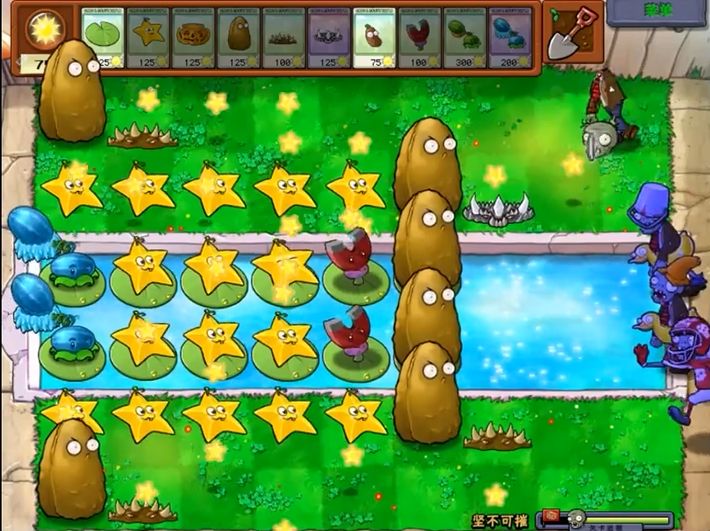 坚不可摧关卡的核心思路是攻防兼备。前排必须用高坚果或南瓜头建立防线,后排则要保证每行都有稳定输出。冰西瓜是个好选择,既能减速又能范围攻击。水路可以全铺杨桃,但记得搭配冰西瓜控制僵尸移动速度,否则杨桃的输出效率会大打折扣。忧郁菇战术也很实用,配合大蒜能让僵尸集中在特定路线。