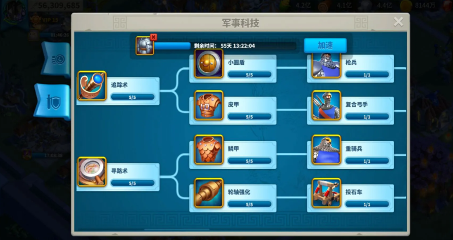 军事科技的研究顺序直接影响转化效率。建议优先完成工程学冶金术等缩短研究时间的科技,再集中资源攻克警卫军系列。联盟科技援助可减少10%的研究时间,务必在研究前请求盟友协助。若资源紧张,可暂缓农业类科技,专注军事路线。T3兵种分为步兵、骑兵、弓箭手和攻城武器四类,需根据主力统帅天赋选择优先解锁的兵种类型,避免资源分散。