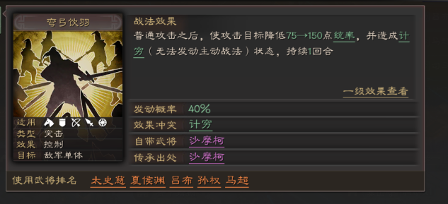 平民玩家可以优先选择鲁莽+文武双全的组合,鲁莽提供洞察效果避免战法被打断,文武双全则通过叠加属性提升伤害。如果没有高级战法,百炼成钢、左右开弓等A级战法也能作为替代。袁绍的弓兵适性为S级,因此万箭齐发、弯弓饮羽等弓兵专属战法也是不错的选择,但要注意避免与自带灼烧效果冲突。