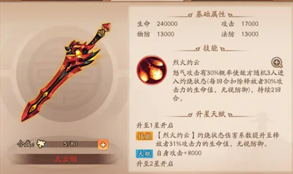 火云剑是张角的核心输出神兵,能显著提升其法术攻击力并提供一定生存属性。该神兵契合张角雷怒黄天证道等技能的爆发特性,尤其在敌方血量低于50%时,配合神兵加成可快速完成收割。若阵容缺乏输出核心,优先选择此神兵可最大化张角的伤害贡献。