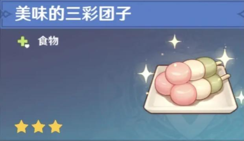 三彩团子是稻妻地区的特色料理,它的食谱需要在完成神里绫华的传说任务后,前往木南料亭花费5000摩拉购买。制作这种团子需要2份牛奶、2份金鱼草、2份绯樱绣球和1份稻米。绯樱绣球是稻妻地区的特产,记得在采集时用雷元素攻击才能获取完整材料。