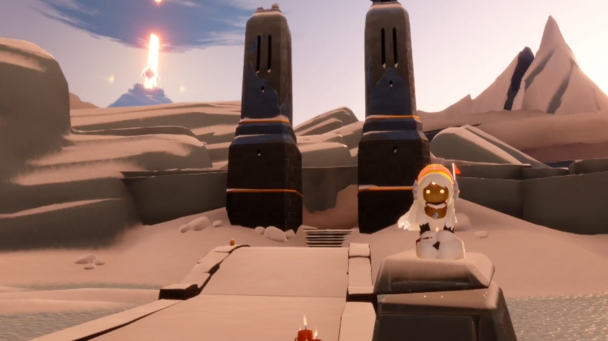 解锁先祖后,屏障就会消失,这时候就能进入山洞了。进去后会发现一条长长的滑道,顺着滑道一路往下溜就行,中途不用操作,尽情享受滑行的乐趣吧。滑到底部会到达一个溜冰场,这里就是梦想季的新地图——圆梦村。圆梦村的设计特别梦幻,周围是雪山环绕,中间还有个小村庄,向导先祖就站在显眼的位置等着大家。