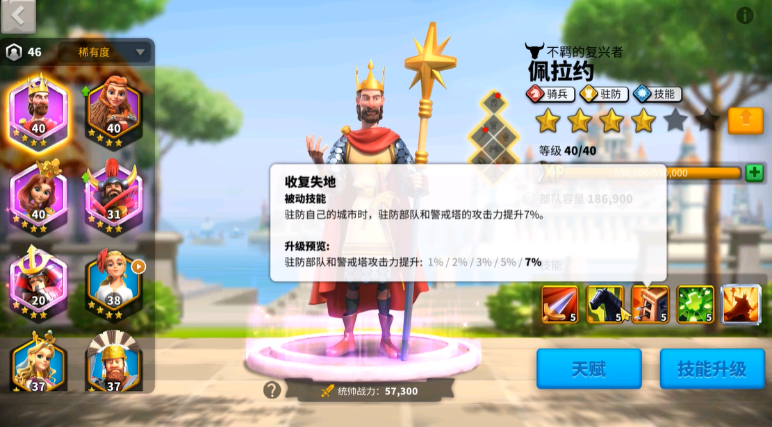 佩拉约的觉醒技能奥瑟瓦誓言会强化阿斯图里亚斯之祖,将骑兵攻防加成提升至15%。作为史诗统帅,这个加成比例已经接近部分传说武将,性价比很高。觉醒后他的定位更偏向辅助型骑兵统帅,适合放在副将位置配合主将输出。建议优先升级骑兵加成被动,驻防技能可以暂时搁置。