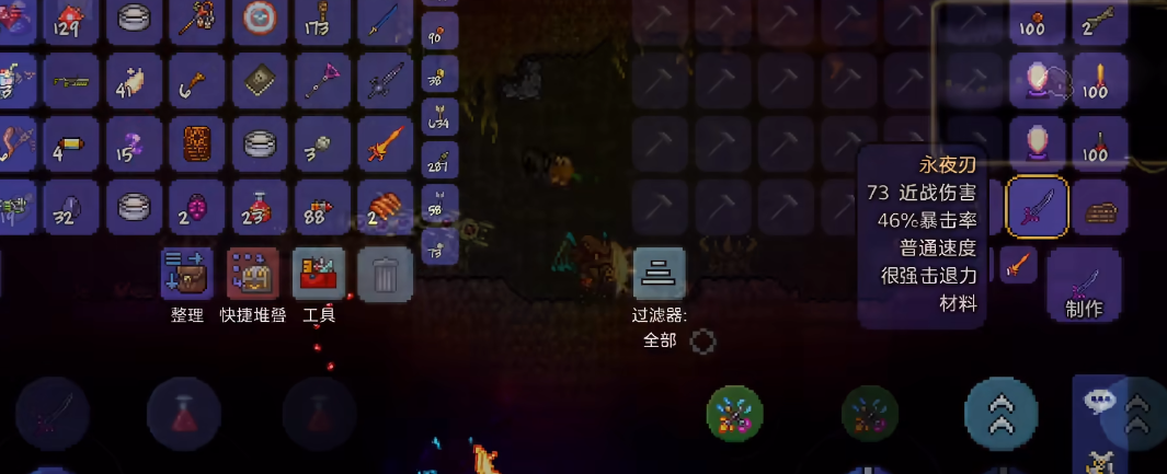 制作永夜之刃,咱们得先准备好四把关键武器:血腥屠刀(或魔光剑)、草剑、妖刀村正和炽焰巨剑。这四把武器分别来自不同区域和合成方式,凑齐后带到恶魔祭坛或猩红祭坛就能合成永夜之刃啦。这把剑在肉山前可是数一数二的强力武器,挥动时还会带点酷炫的光效,绝对是开荒期的好帮手。