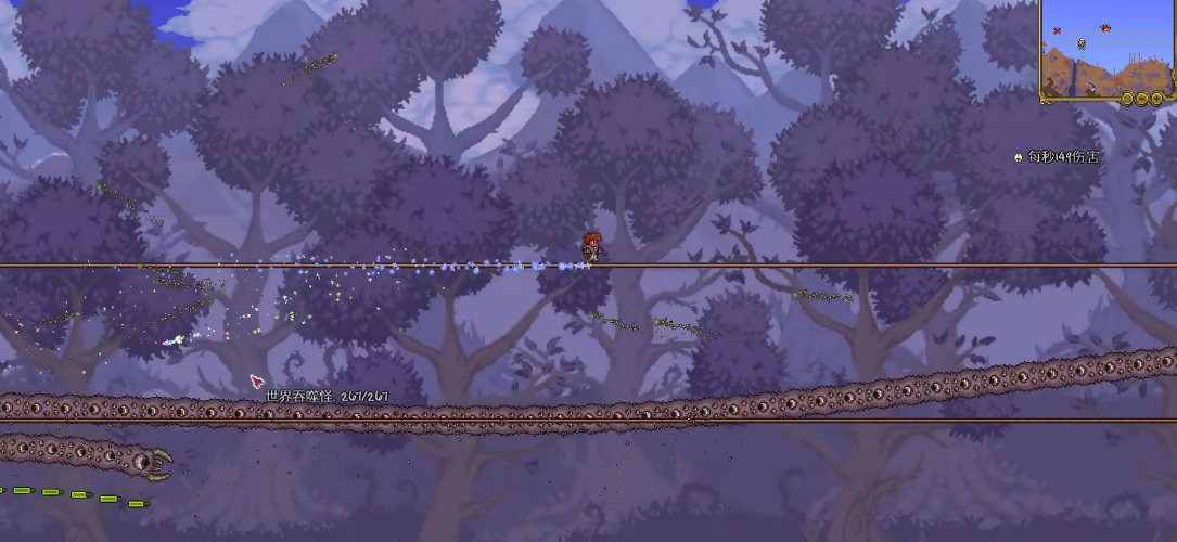 打世界吞噬者之前,最好在腐化之地搭个简易平台,方便走位躲技能。这家伙是一条超长的蠕虫,由好多节身体组成,每节都能独立攻击。推荐用穿透型武器,比如弓箭或链球,能同时打中多节身体。如果装备不够好,记得带点回血药水,因为它分裂后的小蠕虫也会掉治疗星星,边打边吃回血很稳。打完世界吞噬者,别忘了捡掉落的暗影鳞片和魔矿,这些都是做高级装备的关键材料。