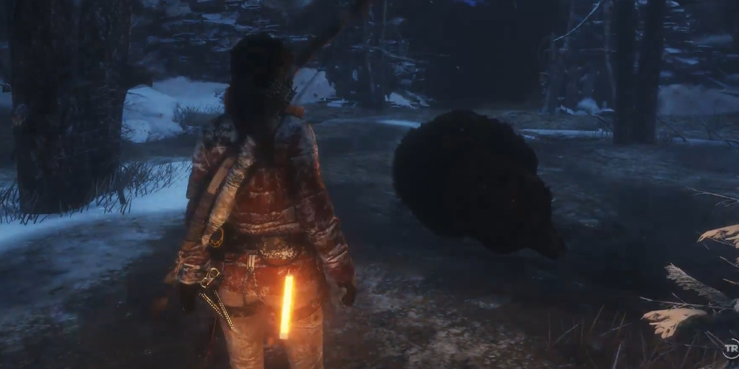遭遇熊的追击是游戏早期的重要生存挑战。首次遇到熊时,玩家必须优先触发QTE机制,通过精准按下闪避键(默认B键或C键)躲过熊的扑击。成功后需立即沿黑色硬质地面逃跑,避免踏入雪地导致移动速度下降。逃跑路线需遵循固定路径:冲向大石头旁的树桩并跳跃而下,随后躲进树根形成的天然掩体短暂周旋,最终退至悬崖边缘完成剧情跳跃。这一阶段的核心在于把握QTE时机和路线选择,任何操作延迟或路径错误都会导致失败。