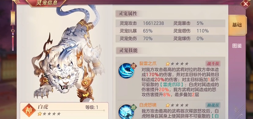 比翼是一星阶段里最强的宠物,不需要升星就能打出较高伤害,技能拥有独特的模仿机制,搭配女团阵容可以直接通关山河遗迹、黄天秘境等副本。玄武是出战泛用性排名靠前的灵宠,技能集回血与伤害为一体,适合用在所有非灼烧队伍里出场,在当前护盾较多的情况下提供稳定的破盾机制。白虎的出战技能主要是给主核心输出提供两次怒气攻击与属性加成,特别适合马超、张辽等直伤核心输出武将,能让伤害几乎翻几倍。