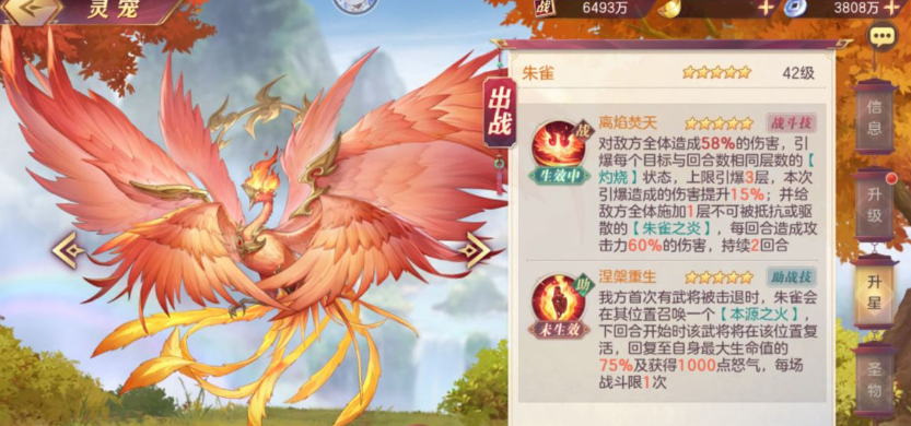 朱雀是火烧队伍的最佳灵宠选择,武将配合体系在朱雀出战技能的引爆下能打出爆发伤害。助战技能可以完美克制盾队,用可持续性火系灼烧破除护盾。穷奇的出战技能伤害较为分散,整体输出数值较低,但开局驱散效果能让怒摇体系几乎失效,建议培养一只应对特定环境。沧干·翼火蛇作为无双灵宠,多了共鸣技优势,主战技能扎实且适用性强,能提供属性削减和稳定控制,助战方向明确为伤害专精。