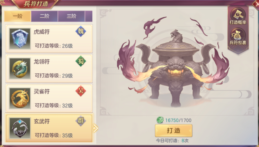 兵符属于核心养成系统之一,主要通过军团炼宝阁打造获取。每日可免费打造一次,额外打造需消耗功勋,橙色品质兵符基础概率为5%并设20次保底机制。兵符分为魏、蜀、吴、群雄四大阵营,品质从低到高依次为白、绿、蓝、紫、橙五档,高阶兵符提供更显著的全体攻击、防御、生命等九类属性加成。解锁条件为玩家等级达到26级并加入军团,系统会引导开启兵符功能。