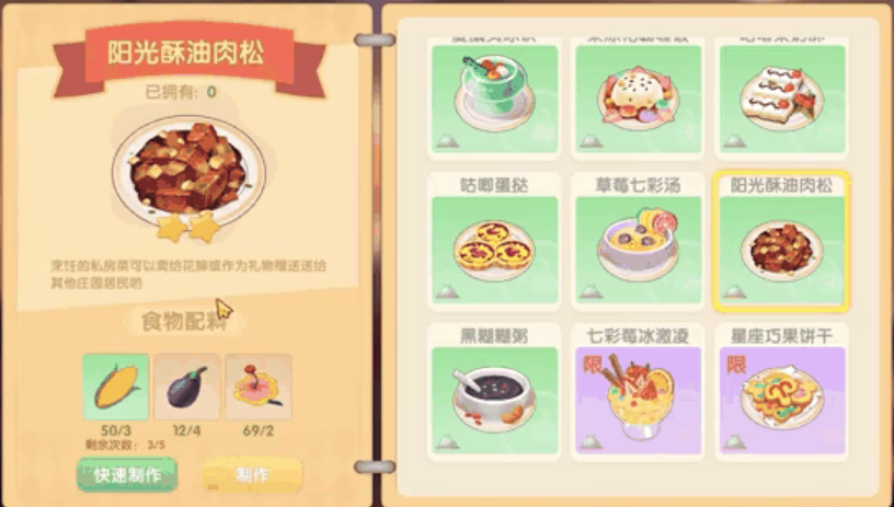 制作这道菜时,玩家应注意游戏内的等级限制和食材添加顺序,错误的操作可能导致失败。阳光酥油肉松作为五星级料理,其价值体现在游戏内的成就感和潜在收益上,玩家通过成功制作能提升角色技能或用于后续交易。