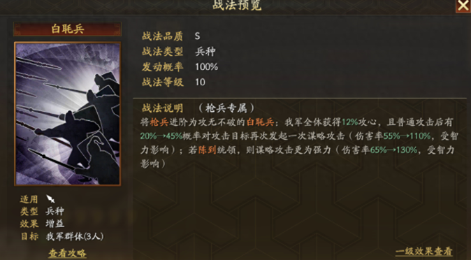 陈到定位为辅助型武将,其核心价值在于自带战法白毦兵,该战法能将枪兵进阶为特殊兵种,战斗中普通攻击后概率触发谋略伤害,伤害率受智力影响,陈到统领时伤害更高。白毦兵机制决定了陈到需绑定枪兵队伍,尤其在高智力法系阵容中发挥最大效能,通过普攻联动补充团队输出,而非作为主力输出角色。陈到的出场率虽随游戏进程有所降低,但他在特定阵容如蜀国体系中仍有功能性作用,尤其适合满红玩家深度开发,以弥补其基础属性不足的短板。