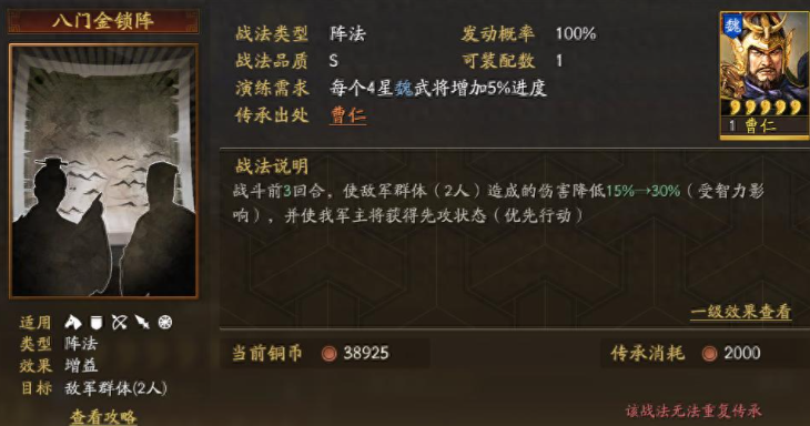 战法选择应侧重功能性与团队配合,优先携带辅助类战法弥补陈到的生存缺陷:八门金锁阵可降低敌军输出并为友军提供先攻,整装待发增强团队续航,暂避其锋保护低统率弱点。干扰型战法如舌战群儒或料事如神也适用,前者能抑制敌方主动战法,后者提供群体伤害削弱。不推荐输出型战法如兵锋,因会进一步降低生存能力。兵书方面,奇正相生或不勇则死的连击效果可增加普攻次数,间接提升白毦兵触发率,但需权衡风险。战法配置需根据对手调整,例如对阵突击队时白毦兵谋略伤害效果显著。