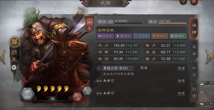 颜良的搭配策略侧重战法联动,其自带所向披靡可作为主力AOE技能,但30%发动率需通过三势阵等战法提升;传承战法盛气凌敌能有效降低敌方普攻伤害,适用于反突击队伍,但颜良自身身板较弱,建议与曹操等辅助武将组队,利用唇枪舌战等嘲讽技能触发反击机制。颜良在枪兵阵容中表现较佳,但需避免与高智谋队伍硬碰,团队中应加入稳定输出点来弥补其发动率不足的缺陷。