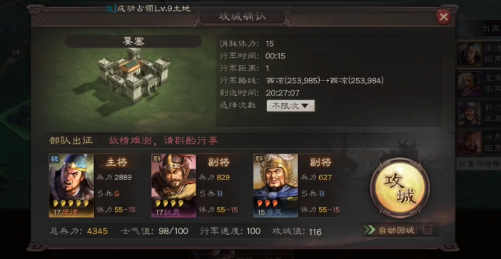 要塞提供2格视野范围,帮助玩家提前侦查敌方动向,从而更安全地执行征兵和调兵操作。在攻打未被占领的要塞时,玩家需击败城防守军和城池守军,前者兵力为600,后者为两队各9000兵力,每半小时刷新一次。成功占领后,要塞即可作为己方的战略据点。合理利用要塞的视野和征兵功能,能够有效控制战场节奏,尤其在资源州争夺战中发挥关键作用。