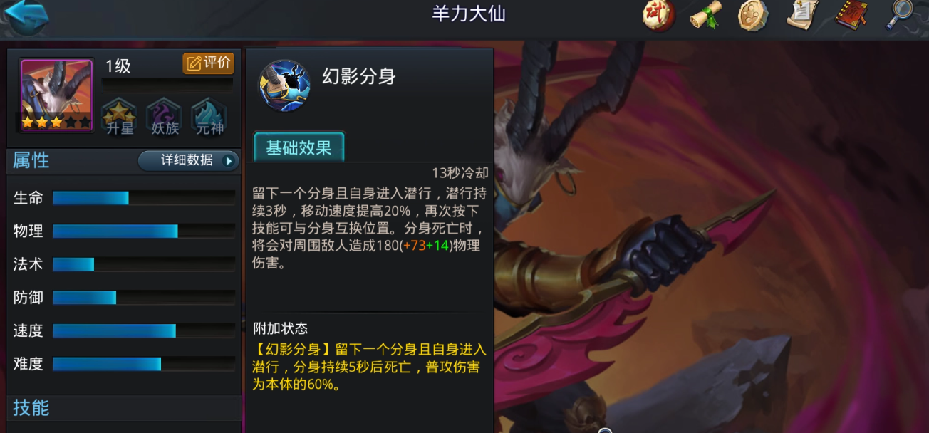 羊力大仙在乱斗西游中是一个以分身和突袭为核心机制的英雄,其技能组合兼具输出、控制和生存能力。合理释放技能是发挥其战斗力的关键,需根据战场局势灵活调整策略。羊力大仙的三个主动技能分别为幻影伏击角刺和幻影分身,每个技能都有明确的战术定位,需结合被动效果和天赋进行联动。