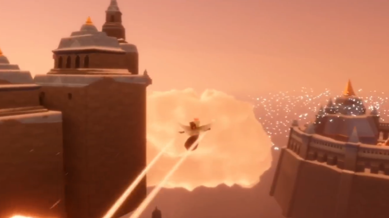 进入洞口后,转身调整视角,抬头能看到一个散发红光的窗口,朝着它飞进去。这段路稍微有点考验飞行技巧,记得蹭云朵恢复能量哦。穿过窗口后,眼前会豁然开朗,大片云层和远处若隐若现的建筑就是千鸟城啦!贴着云一直往前飞,别被风墙吹偏方向,很快就能靠近那座悬浮在空中的城堡。