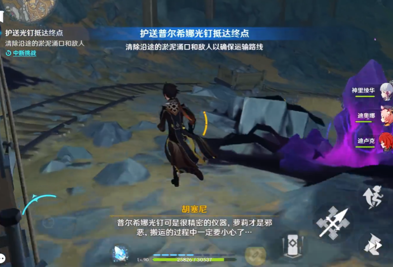 任务触发位置位于层岩巨渊主矿区上方传送点正下方,热气球沿铁轨移动至蓝色箭头标记的终点。运输过程中,热气球遭遇黑泥或魔物时会暂停前进,需及时清理才能恢复移动。黑泥会强化范围内魔物的攻击与防御,并持续对角色造成伤害,建议优先使用流明石触媒净化淤泥涌口,再处理剩余敌人。沿途分布白色光柱可补充3格能量,充能灯也会周期性刷新,需合理规划净化路线。