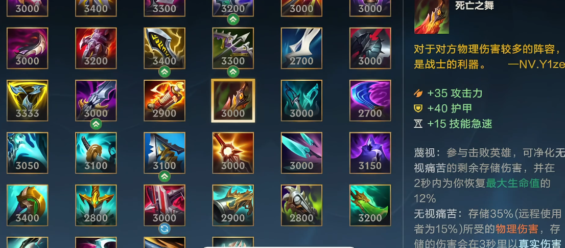 中后期装备成型后,武器需避免正面开团,多从侧翼切入后排。团战连招为Q跳斩接E眩晕,开启R技能提升双抗,W强化普攻完成收割。若敌方控制较多,水银鞋与斯特拉克的挑战护手可提升容错率。逆风局可转半肉出装,死亡之舞搭配兰顿之兆增强生存能力,通过带线拉扯创造翻盘机会。