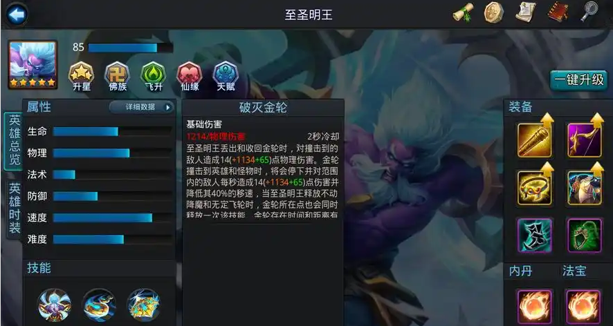 选择望舒魂引的原因在于至圣明王的技能设计偏向物理暴击流,而非攻速依赖型;无定飞轮技能在近距离能造成双倍伤害,若搭配暴击属性装备,可进一步提升伤害倍率,形成高效输出循环。相比之下,攻速装如五虎断魂虽适用于部分战士,但对至圣明王增益有限,因其技能冷却较短且依赖爆发而非持续普攻。紫霄之护的物理攻击强化直接作用于破灭金轮的路径伤害和减速效果,使英雄能更好地控制战场;该武器的防御协同性高,能配合不动降魔的防御提升机制,增强整体坦度。