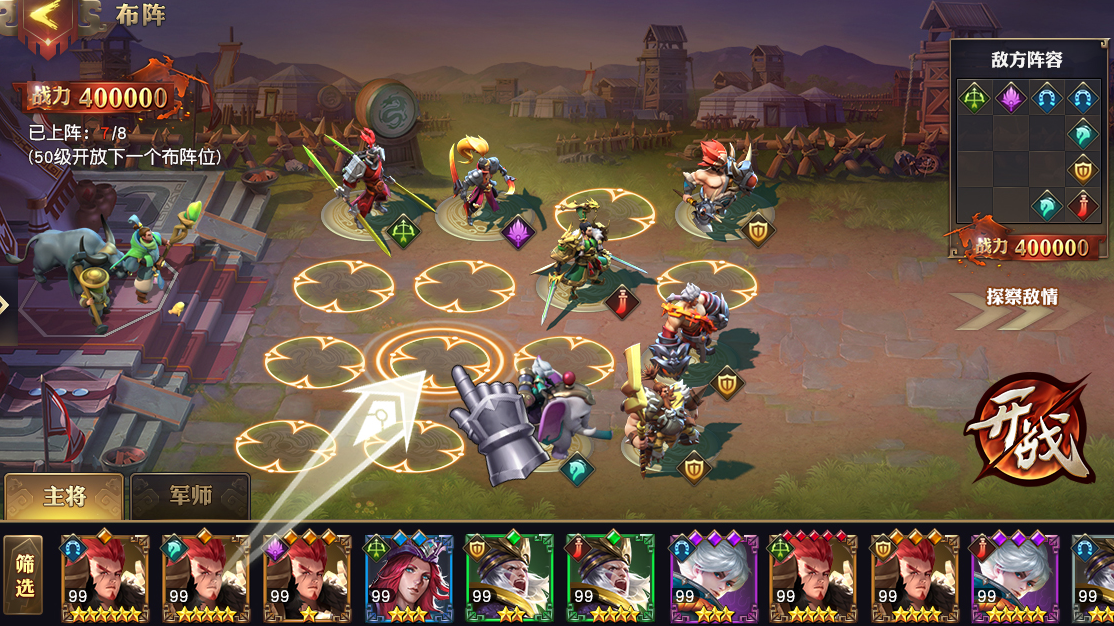 游戏中有步兵、盾兵、弓手、谋士、重骑和轻骑六大兵种,每种兵种都有固定站位规则。步兵和盾兵只能放前两排,弓手和谋士只能放后两排,骑兵则可以自由布置。布阵时要考虑兵种克制关系,比如轻骑专门克制后排弓手和谋士,重骑擅长突破前排防御。合理利用张辽的锐不可当技能可以强化整排单位的攻击力,这时候把所有武将放在同一列能最大化收益。