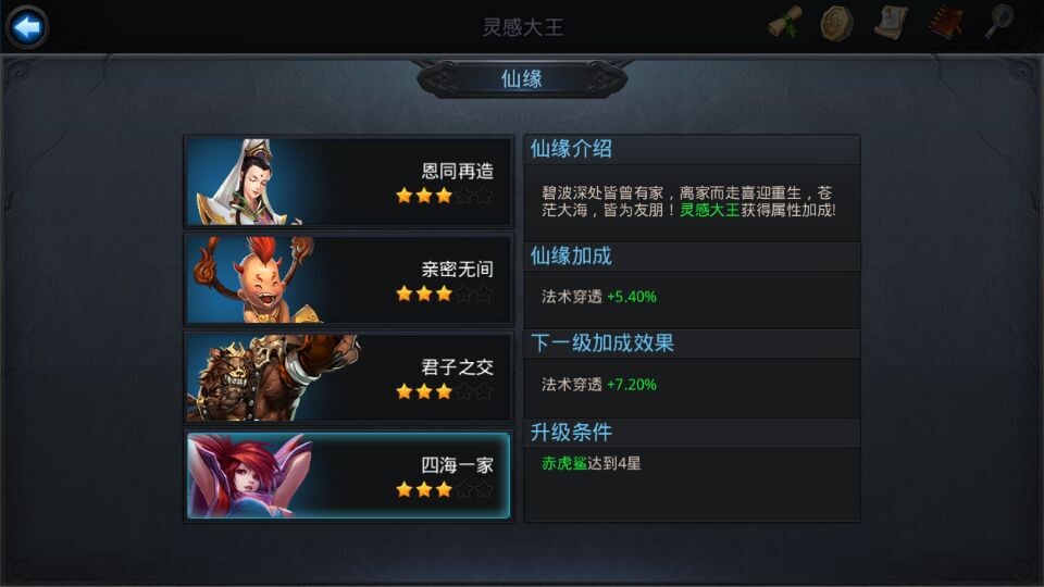 仙缘系统是提升战力的关键,即使咱们资源有限,也能通过合理搭配发挥出超强效果。仙缘的核心在于英雄之间的羁绊,只要拥有三个五星英雄就能开启系统,匹配的仙缘英雄无论是否上阵都能提供属性加成。对于咱们贫民玩家来说,优先选择容易获取且仙缘加成高的英雄,比如铁扇公主、地藏菩萨和哪吒,这些英雄不仅容易培养,还能互相激活仙缘效果。