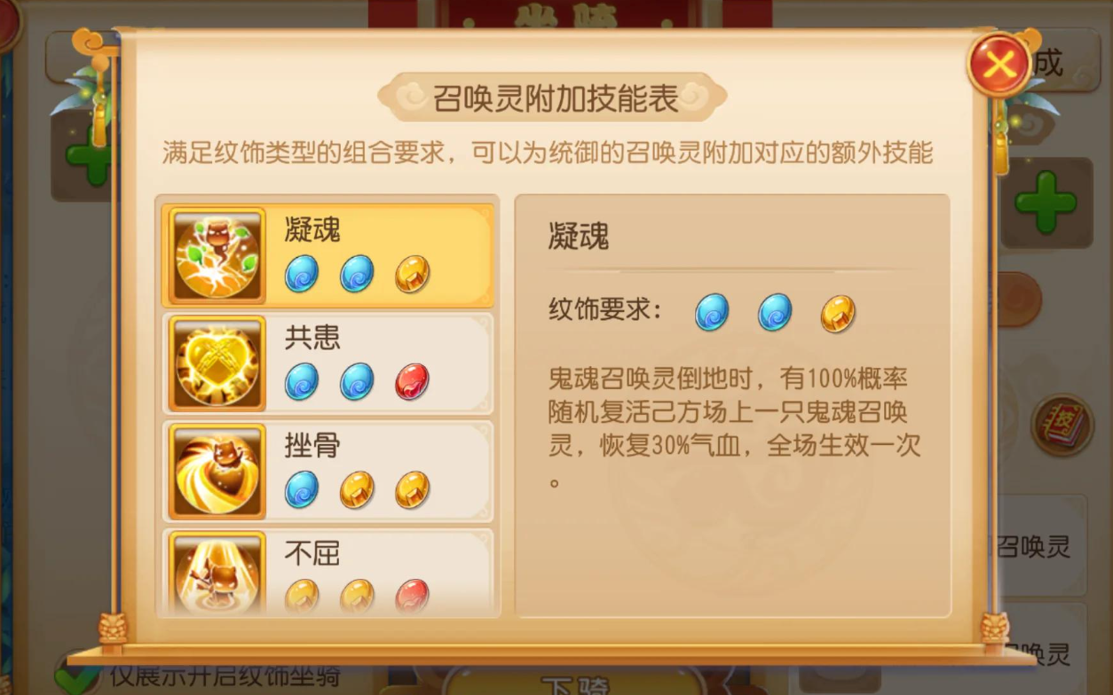 通过特定颜色组合的纹饰镶嵌,可激活六大坐骑技能。两个黄色纹饰搭配红色可激活不屈,提升宠物前两回合生存能力;两个蓝色纹饰搭配红色触发共患,实现人宠伤害分摊;两个红色纹饰搭配蓝色形成硬化,降低连续受击时的伤害结果。这些技能与纹饰基础属性形成互补,使得纹饰搭配需要同时考虑数值提升和战术效果。