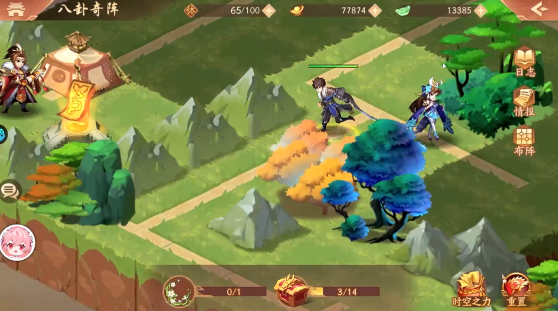 接下来咱们往下走,找到代表木属性的诸葛果,把她击败。打完她之后,回头看看刚进来的出生点左边,之前堵路的障碍消失了。赶紧回去把新出现的敌营3解决掉。打完敌营3,咱们先不急着推主线,往左边这条路往上走,到树林里把奖励宝箱拿了,这可是白给的资源。