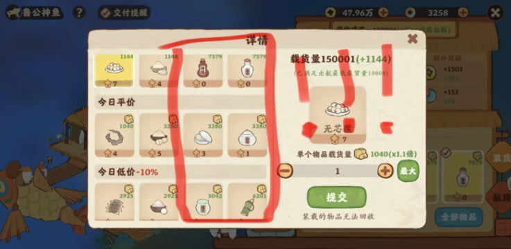 成功开启鲁公神鱼后,咱们每天的主要任务就是给它装货让它出航。货舱就在神鱼边上,每次装货都有时间限制,如果时间到了还没装满,神鱼也会带着装好的货物直接出发;要是手快提前装满了所有货舱,它立刻就会扬帆起航。这里每次最少要装上价值2000的货物它才肯动身。每种货物能占的载货量都不一样,提交之前一定要看仔细,因为货物一旦放进货舱可就拿不回来了。仙女石的等级越高,咱们能利用的奇货价格加成也越划算。
