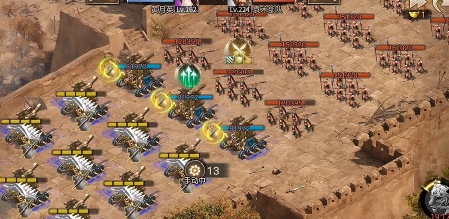 开局先用马超的自动战术快速清理首波小兵,等遇到严白虎部队时转为手动操作,集中火力优先解决他。这个阶段别贪输出,保留主力武将兵力是关键。之后面对孙策部队时,利用黄月英的远程优势消耗对方前排,同时让关羽和周泰切入侧翼破坏战车。特别注意袁术本体会在战场后排释放范围攻击,看到他的抬手动作时,立刻用甄姬的控制技能打断施法,或者让马超开战法限制其行动。