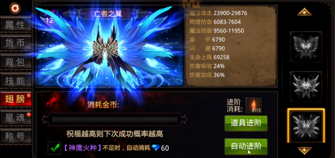 翅膀的进阶是提升其属性与外观的核心机制。翅膀初始为一阶,提升阶数需要消耗特定材料,主要包括羽毛和神鹰火种。羽毛的获取渠道较为广泛,日常在线、活跃任务完成、击败怪物、开启宝箱以及魔晶兑换、商城购买均可获得。神鹰火种则主要通过登录奖励、活跃任务、魔晶兑换或商城购买等途径收集。当翅膀星数达到满星状态后,消耗神鹰火种即可进行进阶操作。进阶过程伴随祝福值积累,祝福值直接影响下次进阶的成功概率,成功进阶后翅膀阶位提升,属性和外观均会得到显著增强。