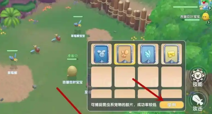当你看到心仪的精灵后,注意看屏幕右下角,那个像小剑一样的图标亮起来时,点它就能进入对战啦!战斗开始后,千万别急着猛打,咱们的目标是抓不是揍。先关掉自动战斗(这很重要哦,开着自动可没法抓),然后你会在技能旁边找到捕捉按钮。点开它,会看到你包里的各种胶片,选一张用上就行啦。
