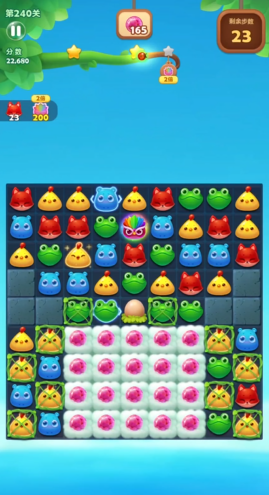 240关需要在37步内收集指定数量的河马、猫头鹰和狐狸这三种动物来完成关卡任务。这一关的布局特点是下半部分布满了实心的冰雪块,而可移动的动物主要集中在上半区域,开局时的可操作空间相对有限,因此首要思路是尽快扩大消除区域。左右两侧各分布着四个章鱼障碍,它们是潜在的干扰源,但需要注意只要不优先消除章鱼上方的雪块,就能延缓毒液的蔓延速度,为规划消除步骤争取时间。开局不必刻意追求消除某一种特定动物,应利用自然的普通消除来积累优势。