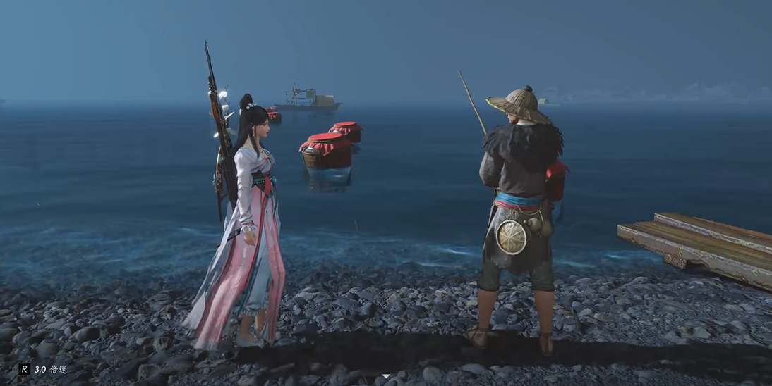 接取任务后,老渔翁会先让你短暂体验飒沓流星轻功的效果,随后真正的学习挑战便开始,江面上会升起一列酒坛。游戏目标是通过跳跃平稳地经过所有酒坛,最终抵达远处的船只,整个过程中不能落水,否则需要重新开始。这个挑战的核心操作是二段跳接冲刺,你需要掌握好跳跃与冲刺之间的节奏和间隔,精准地落在每个目标点上。