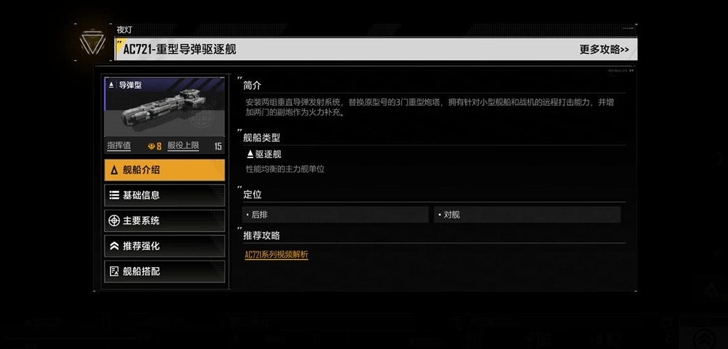 AC721重型导弹驱逐舰的导弹型号在游戏中是一款专注于防空与中远程火力支援的均衡型驱逐舰。该舰船安装了垂直导弹发射系统,替换了原型号的重型炮塔,使其获得了针对小型舰船和战机的远程打击能力,并额外配备了副炮作为火力补充。其综合性能在前期过渡阶段具有一定价值,定位属于舰队中的副C角色,输出能力相对薄弱,但凭借其均衡的特性与明确的防空特长,在特定的舰队编成中能发挥不错的辅助作用。