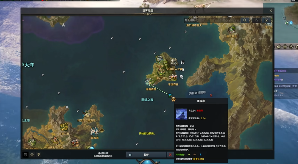 森林的声音任务需要在睡歌岛完成,其核心是参与岛上定期刷新的合作任务并开启沉睡歌曲宝箱,以概率获得任务道具森林的声音。该任务每两小时刷新一次,玩家需留意游戏左上角的岛屿活动倒计时提示,在开放时间内上岛。任务开始前,玩家必须确保已掌握共鸣之歌这一必要演奏曲目,该曲谱需前往伯尔尼海域的佩托水上乐园,在第二层右侧的NPC处消耗16800海盗币购买,海盗币可通过港口商船用其他银币兑换获得。