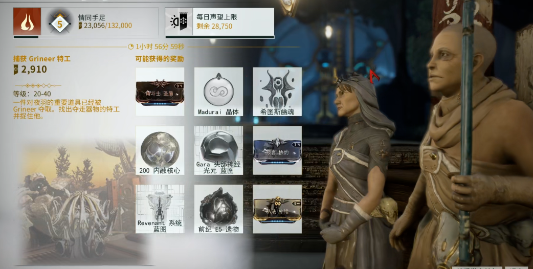 赏金任务由村里的科纳祖发放,分为不同难度等级,任务目标包括解救人质、清除敌人据点、破坏设施等多种类型,完成这些任务能直接获得声望、振幅晶体及资源奖励。积累的声望可用于在赛图斯村的各个供应商处兑换种类繁多的物品,例如战甲配件、武器蓝图、指挥官装饰品、高级采集工具设计图以及独特的强化模块。