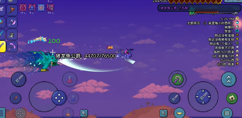 由于猪鲨公爵拥有极高的机动性与攻击力,充分的战前准备至关重要。在召唤前,强烈建议在其出现海域的上空搭建多层次的水平战斗平台,平台之间保持合理间距以方便垂直移动,这能为玩家提供充足的闪避与输出空间。应配备当前阶段最好的翅膀类饰品以增强空中机动性,并携带如铁皮药水、再生药水、敏捷药水等增益药剂以提升生存能力。进入战斗后,需注意其攻击模式,第一阶段它通常在进行五次冲撞后释放一次特殊技能,进入第二阶段后则变为每三次冲撞后释放技能,两种技能会交替使用。该BOSS免疫燃烧、流血、咒火、剧毒及霜火等多种负面状态。
