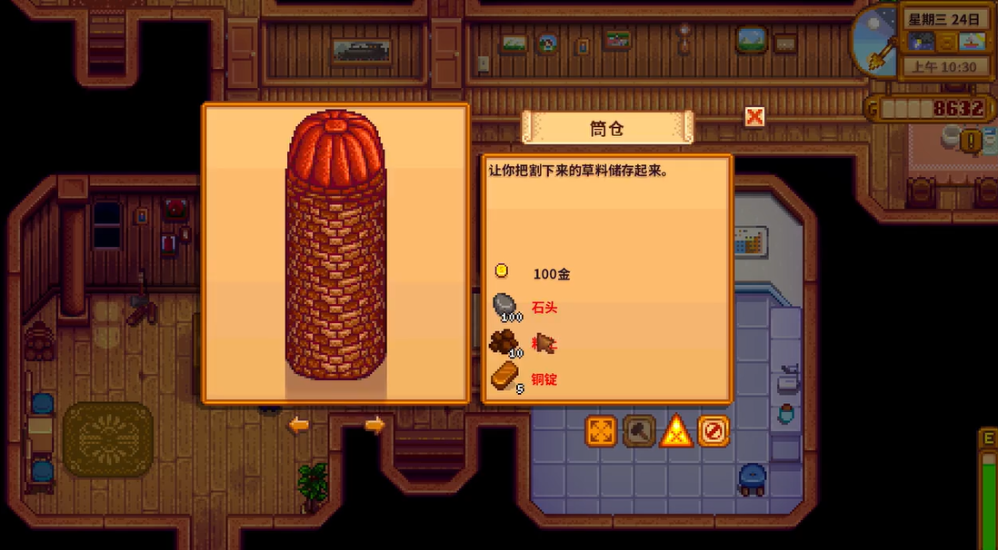 建造谷仓需要玩家前往地图北部的木匠商店,寻找专业的建筑师罗宾。建造所需的材料包括100金币、100块石头、10个黏土和5个铜锭,这些材料可以通过在农场中开采石头、挖掘粘土矿点以及下矿冶炼铜矿石来收集备齐。支付材料和费用后,罗宾会开始为期两天的施工,之后谷仓便会建造完成并投入使用。谷仓并非只能建造一个,当农场规模扩大、动物数量增多导致一个谷仓的干草储量不够时,玩家可以根据需要多建造几个谷仓来扩展总储存容量。