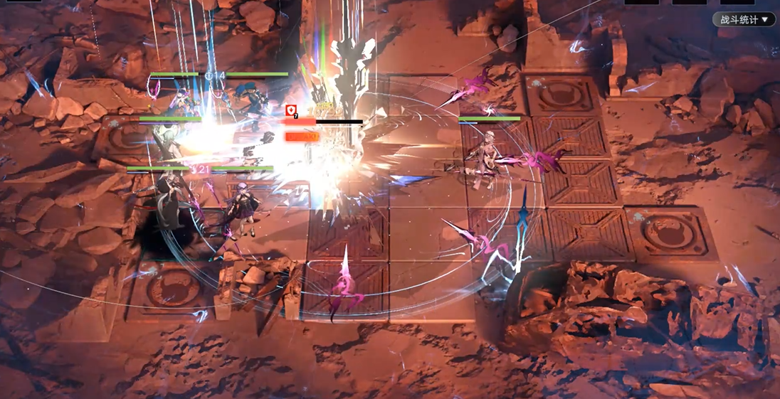 开局后的角色站位布局至关重要。通常将坦克部署在敌人行进路径的前端,治疗者置于安全的后方区域,而输出和破核角色则根据射程和技能范围安插在中间地带。面对关卡内可能出现的特殊机制,例如暗紫色的光影陷阱区域,需要谨慎处理。可以让坦克先手踏入触发,利用其护盾或高血量抵挡持续掉血和减速效果,待debuff消失或通过位移技能快速穿越后,再部署其他队员。战斗时需密切关注精英怪的核心暴露时机,留好破核技能及时打断其高威胁技能。