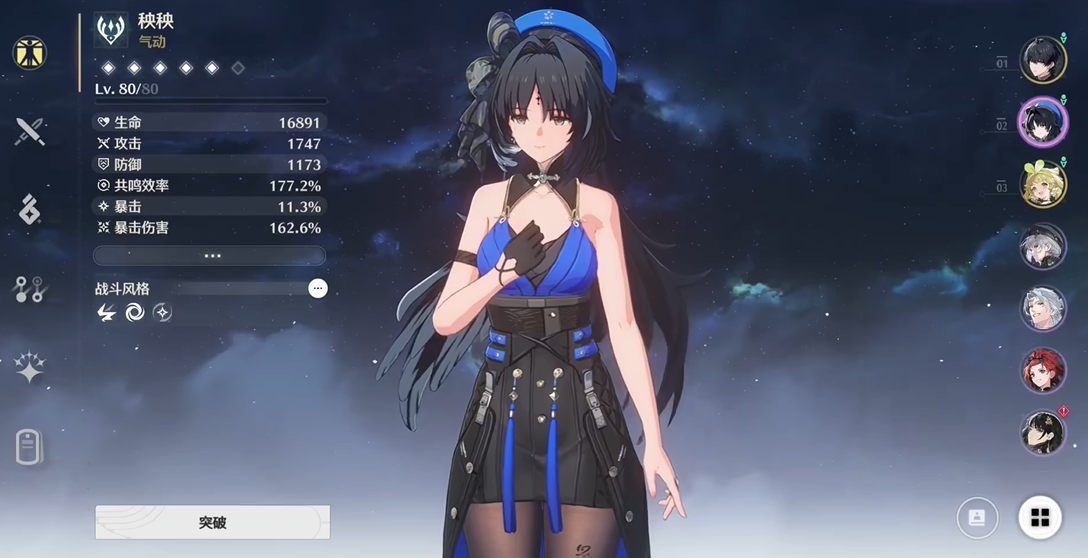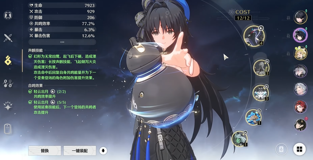 秧秧的技能机制围绕流响层数展开,通过特定操作积攒与消耗层数是玩好她的关键。她的常态攻击第四段、重击·风吟、共鸣技能流风载域以及变奏技能登场都能各自获得1点流响。当累积到3点流响时,长按重击可触发具有击飞效果的重击·风袭,或在空中使用普攻发动消耗所有层数的空中攻击·释羽。她的共鸣技能与大招朔风旋涌均能产生风场,将范围内的敌人牵引至中心,提供稳定的聚怪效果。而她的核心辅助能力体现在延奏技能衍息上,能在下场后为后续登场的角色持续回复共鸣能量,加速整个队伍的大招循环。