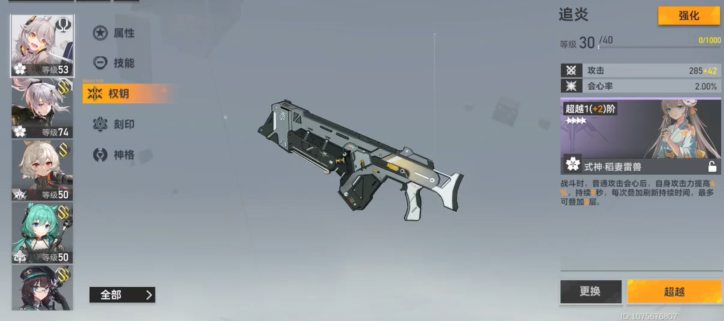 追炎拥有自己的专属钥从。如果资源允许,获取专武能进一步提升她的输出上限,例如增加印记上限,让狙击连发更为顺畅。但对于平民或新手玩家而言,并非必须强求专武,使用通用的五星钥从也可以发挥不错的效果。常见的思路是利用一技能和二技能快速叠加印记,然后开启三技能狙击模式消耗印记进行高额爆发。当奥义技能贯穿狙击充能完毕后,可以在合适的时机释放,它不仅能造成可观的直线贯穿伤害,命中后还能直接为追炎补充大量印记,从而有可能接续新一轮的狙击输出。需狙击模式下角色无法移动,因此释放时机和位置选取需要一定的判断。