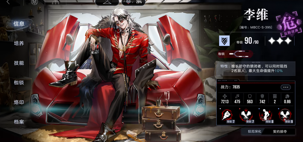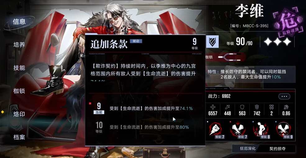 李维是流血队的标准成员。完整的流血队通常以德雷雅为核心输出,搭配堇、胡椒和李维构成基础框架,后期还可加入茉莉进一步提升队伍强度。在这个体系里,李维不仅利用高法抗承担伤害,更重要的是通过自身技能为敌人稳定附加一层生命流逝状态,并放大整个队伍造成的生命流逝伤害。他的狂厄深化效果和专属烙印进一步强化了其在体系内的作用,使他成为串联和增强流血队整体输出的关键拼图。