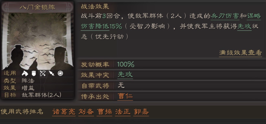 智计本身在特定阵容和时期仍保有一定的应用价值,尤其在玩家资源有限或搭配特定武将时。该战法发动概率较高,且效果可叠加,当由周瑜、陆逊等自带战法需要频繁触发主动战法的武将携带时,能有效联动。智计可作为都督队或蜀智阵容中的功能性组件,配合八门金锁阵等战法形成攻防体系。由于其无法影响速度和统率,在面对以SP马超为代表的高速爆发队伍时显得乏力,这进一步凸显了选择更全面替代战法的必要性。