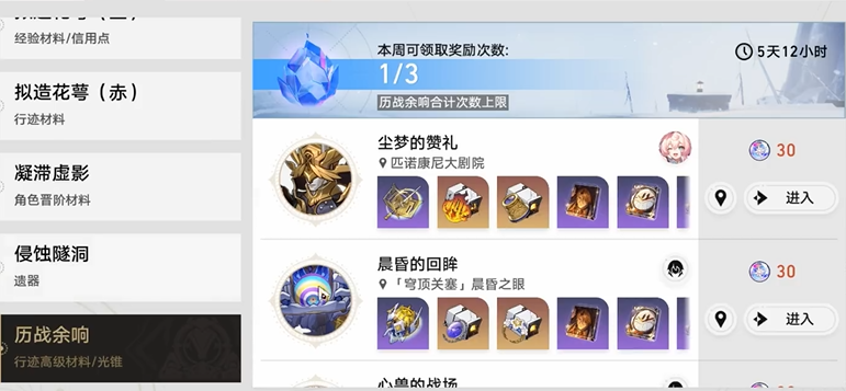 当开拓等级达到20至30级,即均衡等级1后,应将角色和光锥等级拉满,然后开始集中刷取行迹材料,把主力角色的关键技能等级提升起来,这个阶段仍然不建议触碰遗器副本,因为收益较低。此时会解锁历战余响周本,但由于前期等级提升快,建议将周本挑战留到每周日进行,以确保能以当前最高难度挑战,从而获得最丰厚的奖励。