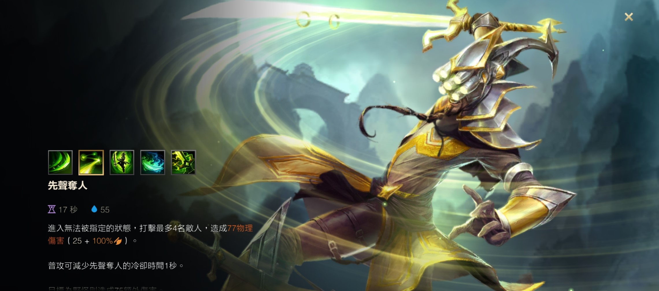 二技能冥想虽然提供了生命回复和伤害减免,但其主要价值在于应对突发的高额伤害或进行残血时的紧急恢复,在一级清野阶段,其长时间引导且无法移动的特性会严重拖慢刷野节奏,导致开局经验和经济落后。三技能无极剑道的主动效果可以提供真实伤害,但在一级时其基础伤害加成有限,且开启后会暂时使被动提供的攻击力加成失效,它缺乏阿尔法突袭的范围伤害和灵活性,在面对多野怪营地时效率明显不足。从功能性、效率与风险控制一级学习阿尔法突袭是无可争议的选择。